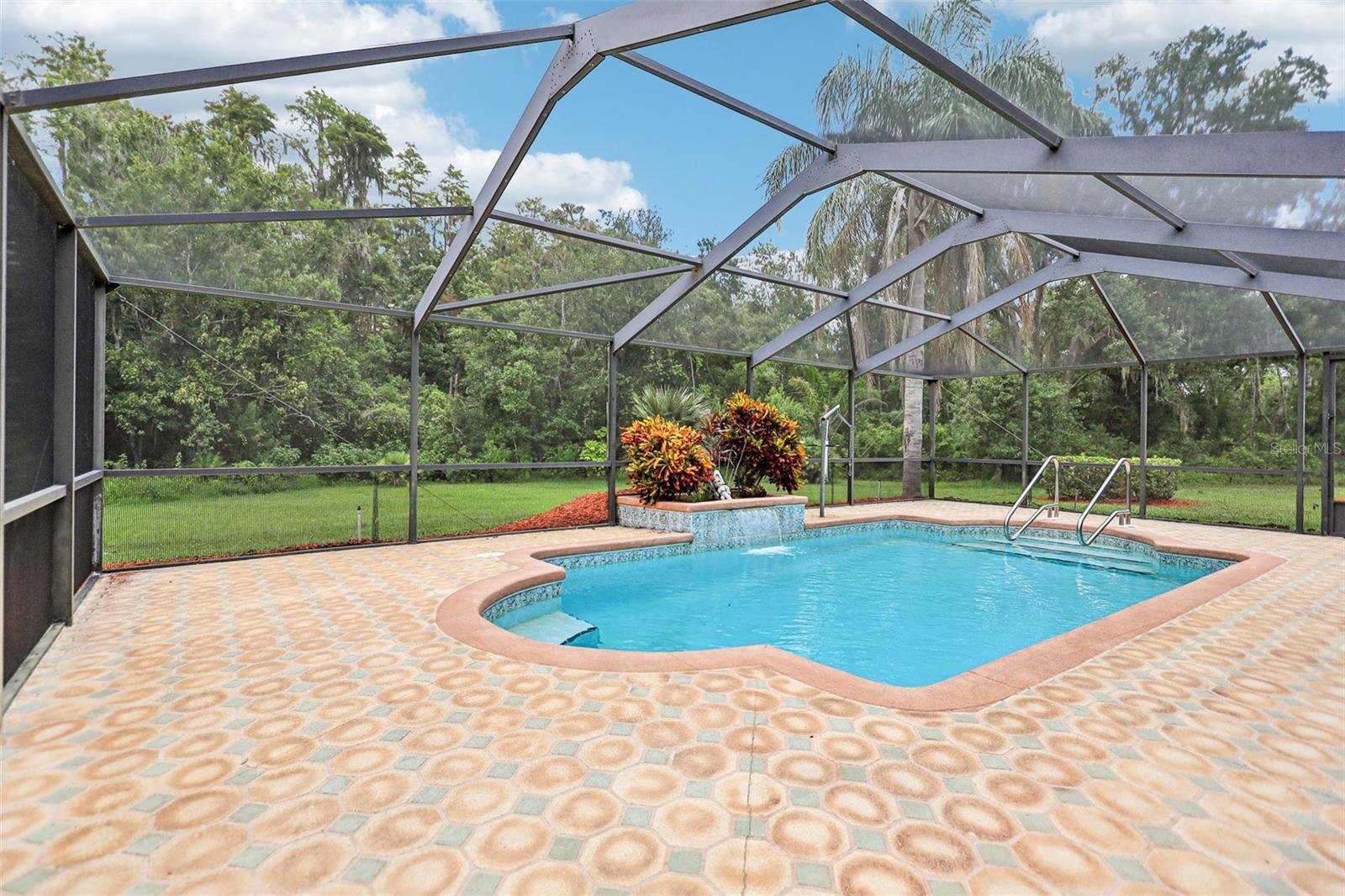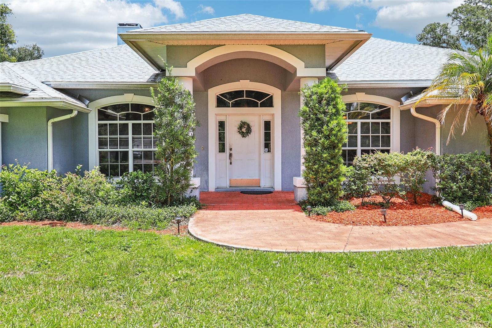 Discover the perfect blend of peaceful country living and modern comfort in this beautifully maintained 4-bedroom, 2.5-bathroom custom home nestled on a 1.48-acre pie-shaped lot at the end of a quiet cul-de-sac. Offering 2,319 sq ft of thoughtfully designed living space, this home provides the privacy, space, and charm you've been searching for. Step inside to find elegant wood flooring throughout, tile in all wet areas, and high-end finishes including tray ceilings, arched entryways, design niches, and custom architectural details. The formal living and dining rooms set the stage for entertaining, while the inviting family room with a cozy fireplace offers a place to relax and unwind. The spacious kitchen is a chef's delight, featuring solid wood cabinetry, granite countertops, plant ledges, and a sunny breakfast nook. All appliances stay, making it move-in ready. The split bedroom layout offers added privacy, with the luxurious primary suite boasting tray ceilings, patio access, a spa-like ensuite bath with granite countertops, Roman walk-in shower, spa tub, and a massive walk-in closet. Enjoy true Florida living with your screened, solar-heated saltwater pool, set against a serene backdrop of mature landscaping and wooded views. The covered patio with a ceiling fan is perfect for outdoor dining or simply enjoying the peaceful surroundings. Additional highlights include roof (2022), water Heater (2022), handicap-accessible design, ceiling fans throughout, laundry room with built-in cabinetry, no carpet, 2-car garage with extended driveway, well & septic system, and a storage shed. Pride of ownership is evident throughout this meticulously cared-for home, from the lush landscaping to the thoughtfully designed interior spaces. Whether you're looking for a place to entertain, unwind, or simply enjoy the outdoors in peace.