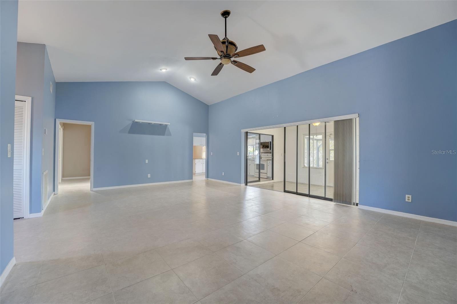 PRICE IMPROVEMENT! Welcome to this well designed home, blending comfort and style through spacious interior and outdoor spaces. From the welcoming open front porch, step into a bright foyer complete with a large coat closet, setting the tone for a well-appointed residence. The heart of the home is the expansive living room and dining room combination, featuring large tile floors, vaulted ceilings, and recessed lighting that creates a warm, inviting atmosphere. Sliding doors open to the enclosed Florida room, an ideal space for relaxation or entertaining, complete with tile flooring and ceiling fans. Culinary pursuits are a pleasure in the kitchen equipped with a long breakfast bar, white cabinetry, a closet pantry, and modern stainless steel dishwasher, microwave, and refrigerator. Recessed lighting and a ceiling fan ensure the space is both functional and comfortable. The family room enhances the home's appeal with a practical wet bar, perfect for hosting gatherings. The large primary bedroom is a private retreat, featuring direct access to the enclosed Florida room through sliding doors. It includes a walk-in closet and an ensuite primary bath boasting dual sinks, extra storage cabinets, an extra-large linen closet, ensuring an organized space. The additional bathroom is well-equipped with a tub and shower, a long vanity, and extra cabinets for storage. Laundry chores are made easy with a nice washer and dryer set in the laundry room, which also includes a utility sink and shelving for added convenience. Step outside to the spacious screened and covered lanai, providing a tranquil setting to enjoy the outdoors comfortably. This area offers ample space for dining, lounging, and enjoying the pleasant climate year-round. This home perfectly combines practicality with elegance, offering a serene living environment ideal for relaxation and entertainment. It is designed to cater to all your needs, making it a wonderful place to call home. You'll love this community which has amazing facilities, pools, and clubs just waiting for you to enjoy. Located between Sarasota and Tampa, it is the perfect location for a convenient ride to airports, great shopping, dining, professional sports, and national award-winning, sandy beaches. This is the best of all worlds but without the stress of big city life. Leave it all behind and enjoy resort style living in one of Florida's most affordable 55 and better communities!